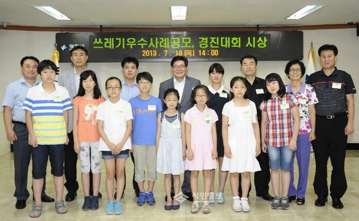 | ▲ 지난해 진행된 '공동주택 음식물류 폐기물 감량 경진대회' 시상식에 참가한 김기동 광진구청장이 쓰레기 우수사례 공모 및 공동주택 경진대회 수상자들과 기념사진을 찍은 모습. (사진제공=광진구청) | ||