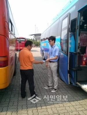 | ▲ 차고지를 돌며 공회전 금지 홍보용 리플릿을 배부하는 공무원의 모습. 지난 10일부터 중점 공회전 제한 장소에서는 사전 경고 없이 단속이 실시되고 있다. (사진제공=마포구청) | ||