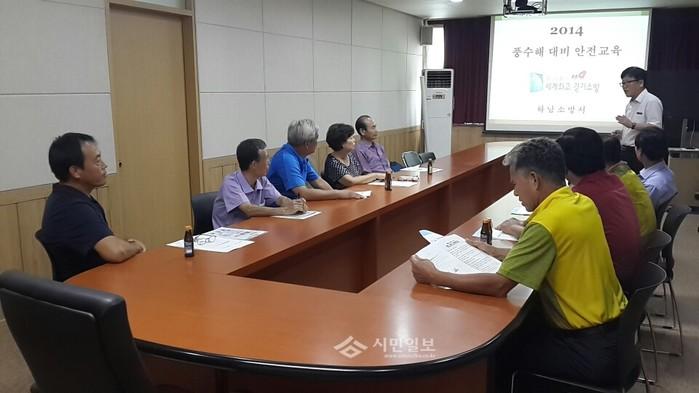 [시민일보=전용원 기자] 하남소방서(서장 음두호)는 지난 1일 오후 본서 2층 소회의실에서 하남시 동 별 통장님 10여명이 참석한 가운데 풍수해 대비태세 확립을 위한 「2014 풍수해 대비 안전교육」을 실시했다.