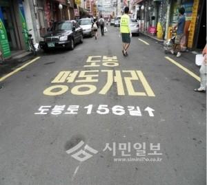 | ▲ 도봉구에서 최근 노면에 도로명을 표시해 도로명주소의 적극적 홍보와 예산절감 두가지 효과를 보고 있다. 사진은 도로명을 시작 부분에 표기한 모습. (사진제공=도봉구청) | ||