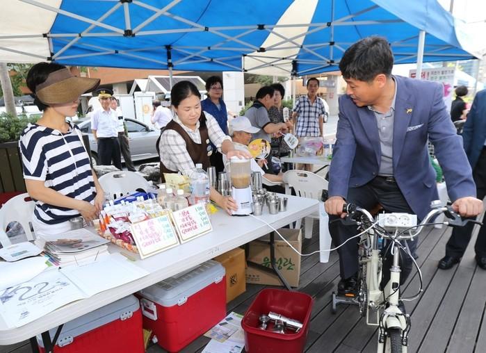 | ▲ '실감나는 성북절전소의 날' 행사에 참석한 김영배 성북구청장이 자전거 발전기를 체험하고 있는 모습. (사진제공=성북구청) | ||