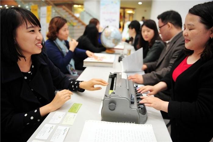 | ▲ 지난해 송파구청 로비에서 진행된 ‘2013 점자의 날’ 행사. 구청을 찾은 민원인들이 점자명함을 만들고 있다. | ||
