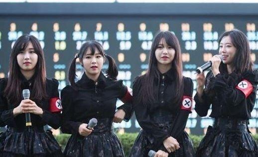 신인 걸그룹 프리츠는 이달 초 경마공원 행사에서 왼팔에 두른 빨간 완장과 그 안에 새겨진 'X'자 문양의 검은색 의상을 입었다.