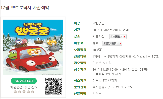 뽀로로택시를 이용하려면 예약이 필요하다. 뽀로로택시 예약은 어디서 할 수 있을까? 바로 서울시 공공서비스예약 홈페이지(yeyak.seoul.go.kr)를 통해 예약할 수 있다. 현재 뽀로로 택시 12월달 사전예약 접수도 진행되고 있다. 단, 예약은 하루 총 10건으로 제한돼 있다.