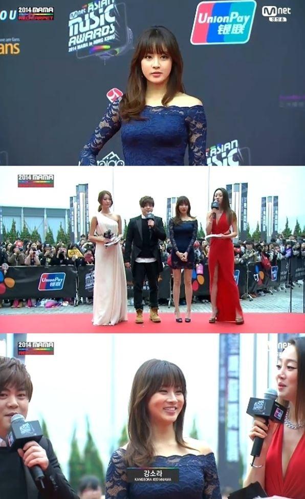이날 '2014 MAMA' 레드카펫 행사에 참석한 배우 강소라는 네이비 컬러 망사로 된 밀착 드레스를