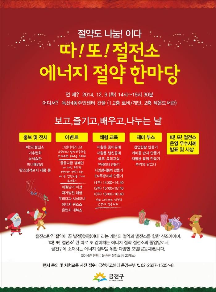 | ▲ 오는 9일 오후 2시 독산4동 주민센터에서 열리는 '따!또! 절전소 에너지절약 한마당'의 홍보 포스터. (사진제공=금천구청) | ||