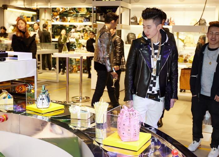 독일 럭셔리 브랜드 MCM이 5일 강남 코엑스 몰 <MCM LAB> 매장에서 플래그십 스토어 ‘MCM LAB’ 오픈 기념 파티행사를 연 가운데, 박재범이 매장 내에 설치된 컨베이어 벨트 위 가방 제품들을 둘러보고 있다.