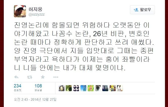 앞서 허지웅은 지난 25일 '진중권·허지웅·정유민의 2014년 욕 나오는 사건·사고 총정리'라는 제목의 한겨레신문 기사에서 '국제시장'에 대해 평했다.