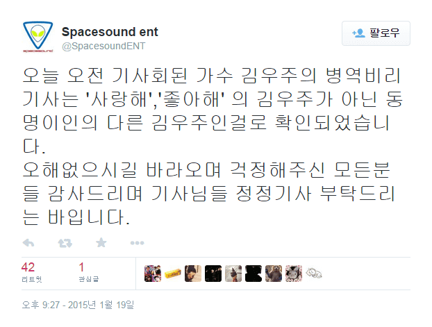 스페이스 사운드측에 따르면 "오늘 오전 기사화된 가수 김우주의 병역비리기사는 '사랑해', '좋아해' 의 김우주가 아닌 동명이인의 다른 김우주인걸로 확인됐다"며 "오해없길 바라며 걱정해준 모든분들 감사드린다"고 전했다.