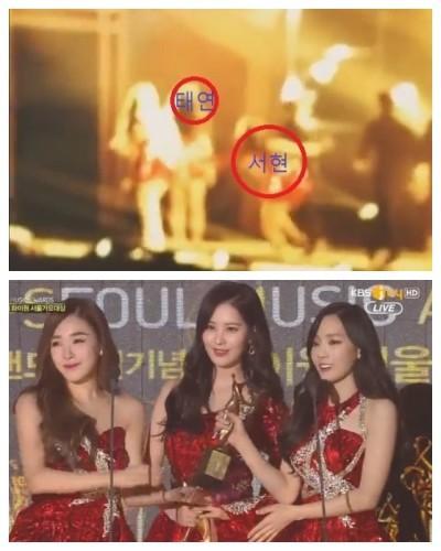 당시 태연 옆에서 퇴장하던 태티서의 다른 멤버 서현은 간신히 피해 추락을 피할 수 있었다.