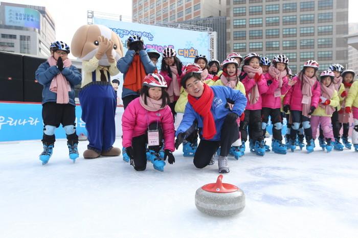 | ▲ 23일 이광구 우리은행장(사진 가운데)이 서울광장 스케이트장에서 열린 ‘우리은행과 함께하는 신나는 스케이트 대회’ 에서 지역아동센터 어린이들과 컬링 체험을 하고 있다. | ||