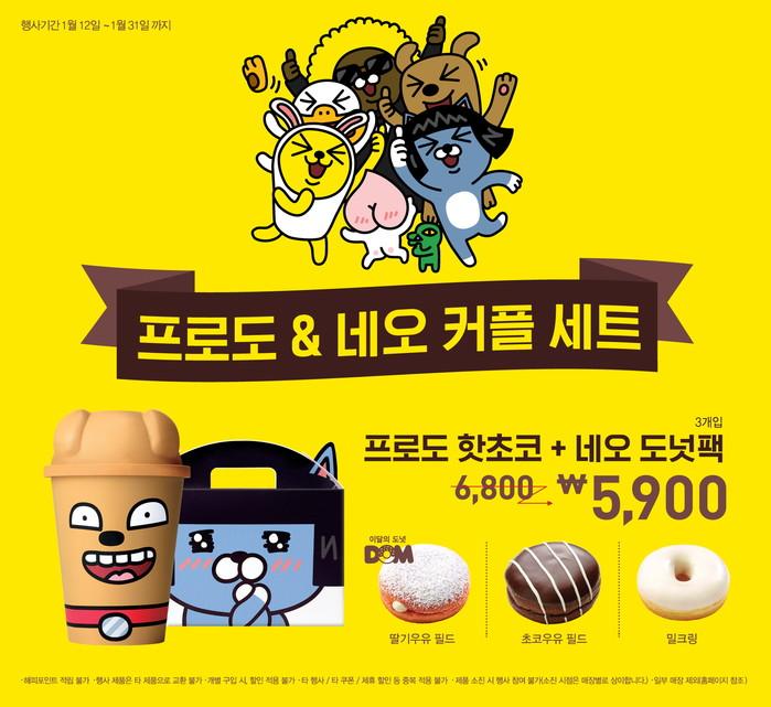 '프로도&네오 커플 세트'는 카카오프렌즈의 인기 캐릭터인 '프로도' 모양의 컵에 핫초코와 '네오' 캐릭터 모양의 도넛 팩에 도넛 3종(딸기우유 필드, 초코우유 필드, 밀크링)을 담은 것이다.