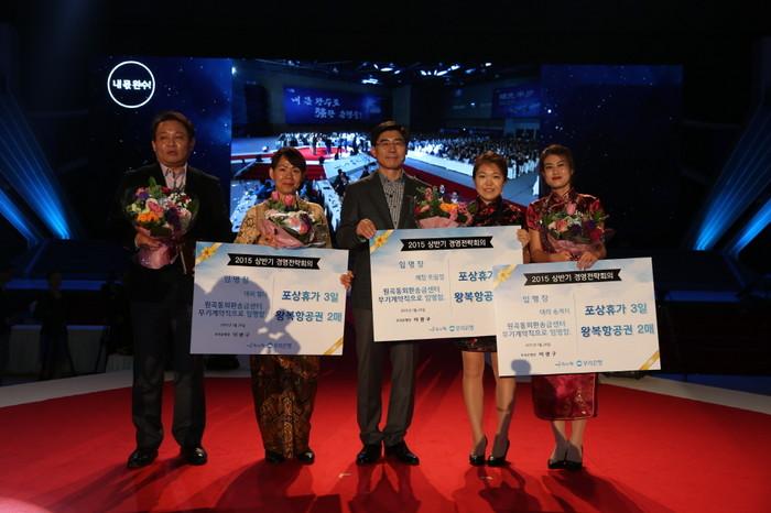 | ▲ 지난 24일 일산 킨텍스에서 열린 경영전략회의에서 이광구 우리은행장(사진 가운데)이 원곡동외환송금센터 외국인직원 및 출장소장에게 특별 승진 및 포상을 한 후 기념 촬영을 하고 있다. (왼쪽부터 우리은행 원곡동외환송금센터 김장원 지점장, 멜다 대리, 이광구 우리은행장, 오림정 계장, 송계지 대리) | ||