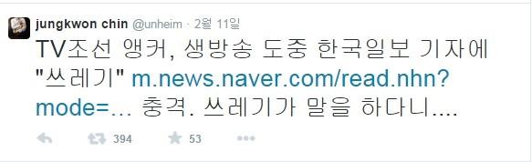 12일 진중권 교수는 자신의 트위터에 "TV조선 앵커, 생방송 도중 한국일보 기자에게 '쓰레기'"라는 기사를 제목과 함께 링크한 뒤 "충격. 쓰레기가 말을 하다니..."라는 글을 게재했다. 이는 지난 11일 엄성섭 TV조선 앵커가 생방송 도중 이완구 총리 후보자의 녹취록을 유출한 한국일보 기자를 "쓰레기"라고 표현한 것을 지적한 것이다.