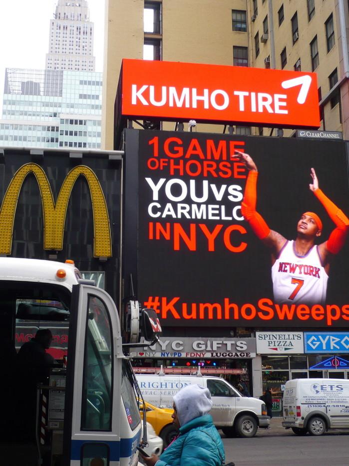 | ▲ NBA 올스타를 테마로 한 금호타이어의 광고가 뉴욕 중심주의 한 전광판에서 나오고 있다.(사진제공=금호타이어) | ||