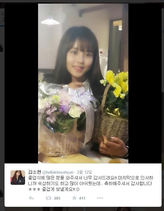지난 12일 김소현은 자신의 트위터를 통해 "졸업식에 많은 분들 와주셔서 너무 감사드려요! 마지막으로 인사하니까 속상하기도 하고 많이 아쉬웠는데. 축하해주셔서 감사합니다. ㅎㅎㅎ 즐겁게 보낼게요!!"라는 글과 사진을 공개했다.