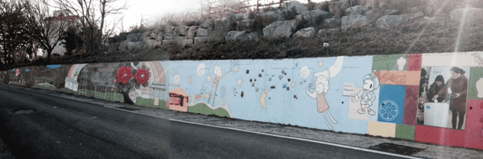 군은 지난 8일까지 강진읍 서성리의 대형 창고벽면, 옹벽 4구간 총 1,020㎡를 대상으로 벽화를 조성했다. 강진고등학교 주변의 낡고 허름했던 벽면에 학생들의 부조작품과 벽화를 그려 넣어 지역민의 눈길과 발길을 끌고 있다.
