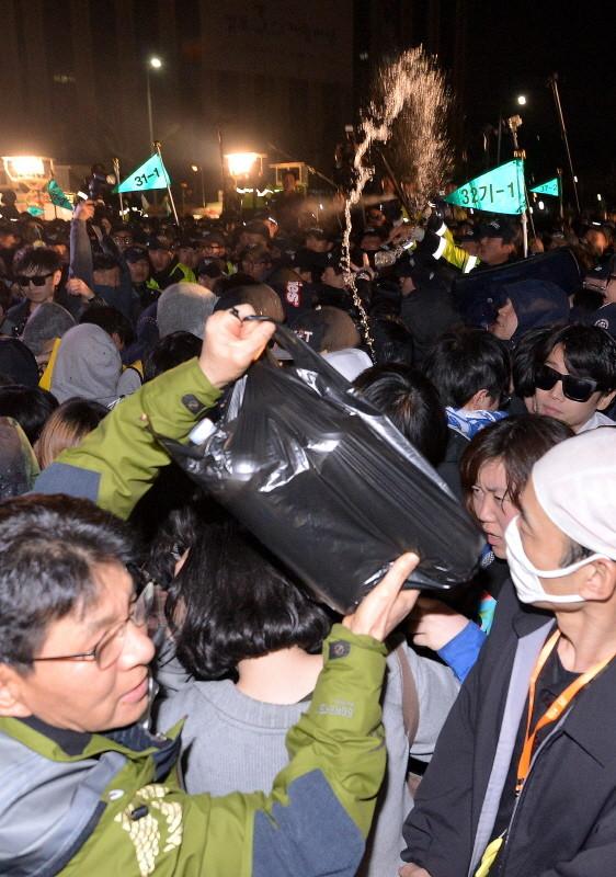 | ▲ 세월호 참사 1주기를 닷새 앞둔 11일 오후 서울 광화문광장에서 416 가족협의회 등 세월호 참사 유가족 및 세월호 국민대책회의 등 관계자들이 세월호 선체 인양과 세월호 특별법 시행령 폐지를 촉구하며 경찰과 대치했다. 경찰 병력이 최루액을 뿌리자 일부 참가자가 물병을 던지며 맞서고 있다./뉴시스 | ||