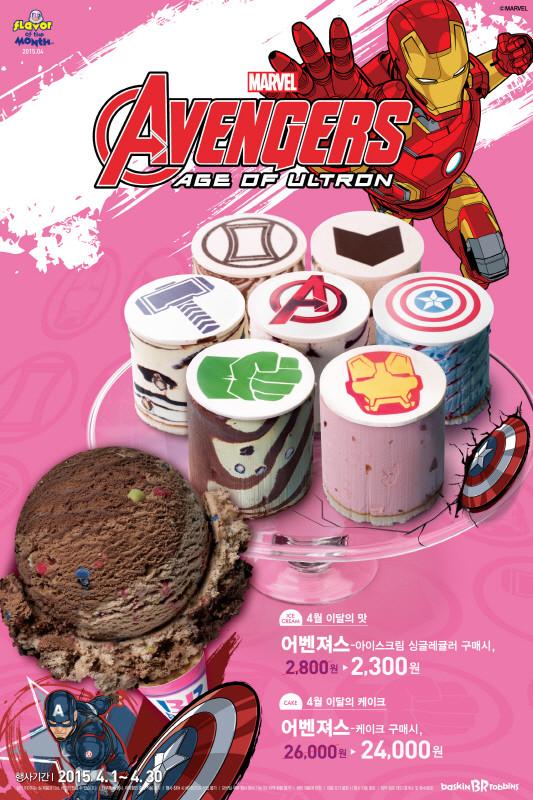 영화 '어벤져스: 에이지 오브 울트론'의 주인공인 슈퍼 히어로 '어벤져스'가 개봉 후 온 국민들의 입과 눈을 즐겁게 하고 있는 가운데, 4월 '이달의 맛'으로 출시된 '어벤져스-아이스크림'은 진하면서 부드럽고 달콤한 3가지 초콜릿맛 아이스크림 속에 '어벤져스'의 인기 캐릭터인 아이언맨, 헐크, 캡틴 아메리카를 상징하는 팝핑 캔디가 어우러진 제품이다. 초콜릿 훠지 아이스크림, 초콜릿 아이스크림, 밀크 초콜릿 아이스크림이 아이언맨을 상징하는 레드, 헐크의 그린, 캡틴 아메리카의 블루 팝핑캔디를 만나 달콤하면서도 톡톡 튀는 맛을 선사한다. 권장소비자가격은 싱글레귤러 기준 2800원.