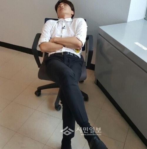 사진 속에는 의자에 앉아 팔짱을 낀 채 잠이 든 자신의 모습이 담겨있다. 특히 누운듯한 상체와 앉아있는 하체가 불안해 보이면서도 균형을 잡고 있어 눈길을 끈다.