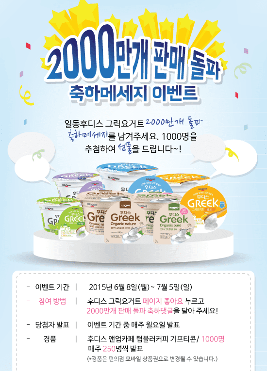 일동후디스는 이번 <후디스 그릭> 2000만개 판매 돌파를 기념해 8일부터 오는 7월 5일까지 페이스북 이벤트를 진행한다. 후디스 그릭요거트 페이지 ‘좋아요’를 누르고, 축하댓글을 달면 총 1000명에게 모바일 기프티콘을 증정한다.