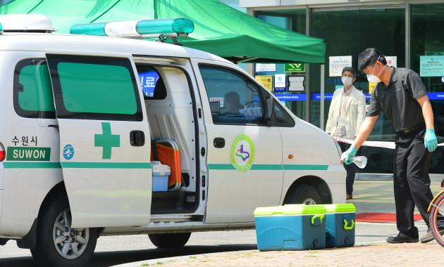 | ▲ 전국 최초로 메르스(MERS·중동호흡기증후군) 환자만을 진료하는 메르스 전담병원인 경기도의료원 수원병원이 가동을 시작했다. 10일 오전 이 병원에 입원한 메르스 의심환자의 검체를 담은 박스를 수원 장안구보건소 관계자들이 경기도보건환경연구원으로 이송하기에 앞서 소독하고 있다. | ||