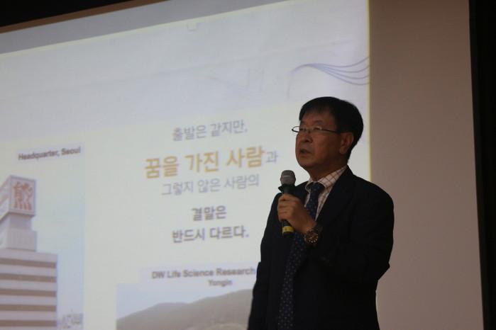 | ▲ 대웅제약 이종욱 사장이 경기도 용인시 대웅경영개발원에서 진행된 ‘소장 학습과 소통의 날’에서 사업부장 및 소장 72명, PM 47명을 대상으로 ‘회사의 미래와 직원의 비전’을 주제로 강의를 진행하고 있다.(사진제공=대웅제약) | ||