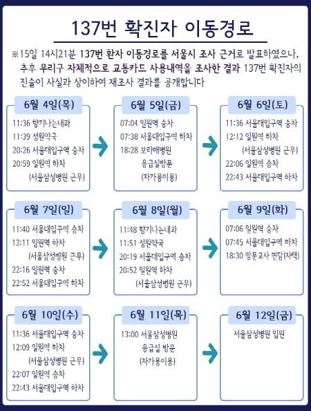 이는 서울 관악구(구청장 유종필)가 지난 4~12일 총 8일간의 행적이 담긴 137번 환자(관악구 거주)의 교통카드 사용내역 분석결과를 토대로 조사한 이같은 이동경로를 16일 공개하면서다.