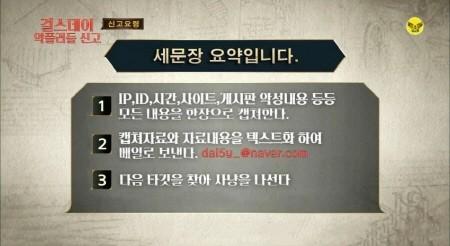 해당글 게시자는 공지를 통해 악플 신고요령과 함께 "자료는 일괄 정리돼 정확한 내용들만 소속사 담당자에게 전달돼 신고처리 된다"면서 "해외 거주시에도 고소시 한국에 있는 가족들에게 통보가 된다"고 밝혔다.