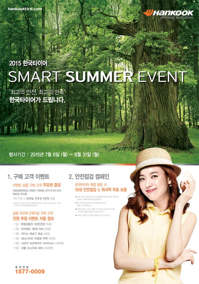 글로벌 선도 타이어 기업 한국타이어(대표이사 서승화)가 여름 휴가철을 맞아 타이어 구매 고객 대상으로 여행상품권과 주유권 등 다양한 경품을 제공하는 ‘2015 한국타이어 스마트 썸머 이벤트’를 오는 8월31일까지 실시한다.