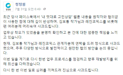 청청원은 "최근 당사 페이스북에서 '내 멋대로 고민상담' 웹툰 내용을 원작자와 협의없이 사용한 점에 대해 깊이 반성하며, 김보통 작가님과 레진코믹스를 비롯해 팬 여러분께 머리숙여 사과드린다"면서 "현재, 김보통 작가님과 레진코믹스 관계자분께 연락을 드려 정식으로 사과드렸으며, 추후 다양한 방식으로 발전적이고 원만한 협의 방안을 논의 중"이라고 밝혔다.