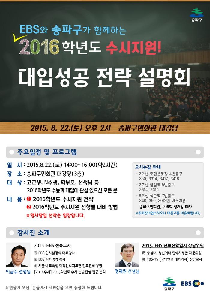 일정은 오후 2시부터 약 2시간 동안 진행된다. EBS 전문 강사진(2015 EBS 전속교사 ‘이금수 선생님’, 2015 EBS 진로진학입시 상담위원 ‘정제원 선생님’)이 강단에 올라 ▲2016학년도 수시지원 전략 ▲2016년도 수시지원 전형별 대비방법 등 체계적이고 정확한 입시정보를 제공할 예정이다.