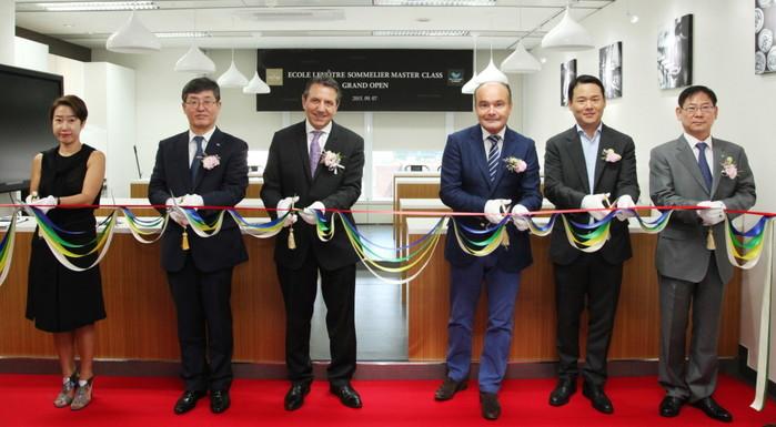 7일 양재동 SPC그룹 사옥에서 열린 ‘르노뜨르 소믈리에 마스터 클래스’ 그랜드 오픈식에서 (왼쪽부터) 최지현 학생대표, 권인태 ㈜파리크라상 대표이사, 에릭 레오테(Eric Leautey) 에꼴 르노뜨르 교장, 올리비에 푸시에(Olivier Poussier) 세계 소믈리에 챔피언, 허진수 SPC그룹 글로벌경영전략실장, 피재만 SPC그룹 미래창조원장이 리본 커팅식을 진행하고 있다.
