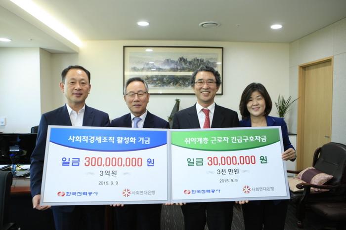 한국전력(사장 조환익)은 지난 9일 본사에서 기금 3억3000만원을 사회연대은행에 전달하고, 한국사회적기업진흥원, 사회연대은행과 함께 사회적경제 활성화 지원사업을 시행한다.