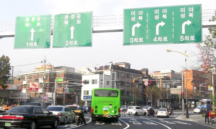 교통표지판은 문형식으로 설치, 방면별 회전차로 위에 표지판 문안을 일치시켜 운전자의 시인성을 크게 향상시켜 혼란을 방지했다.