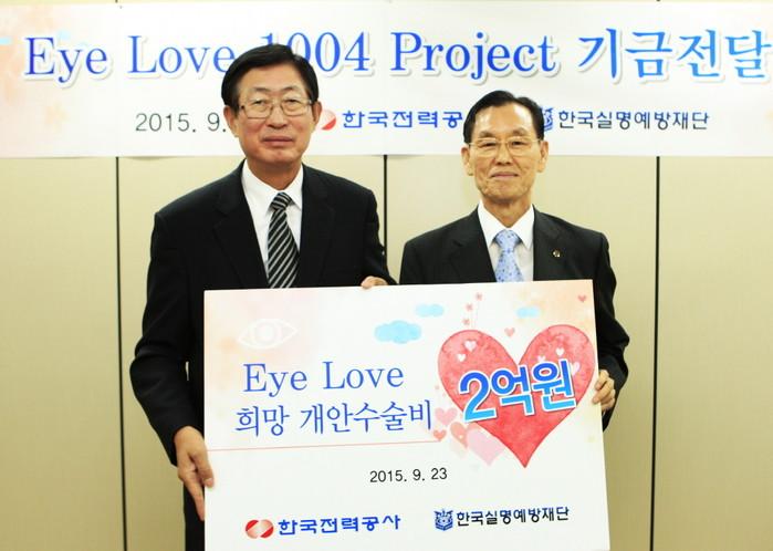 한전은 2011년부터 시각장애우에게 빛을 선물하는「Eye love 1004 Project」를 추진중으로 매년 약 100여명을 지원중이며 2021년까지 1,004명에게 개안수술을 지원할 계획임. 올해에도 가정 형편이 어려워 수술을 받지 못하고 있는 국내시각장애인 80명과 해외 시각장애우 20명에게 빛을 선물할 예정이다