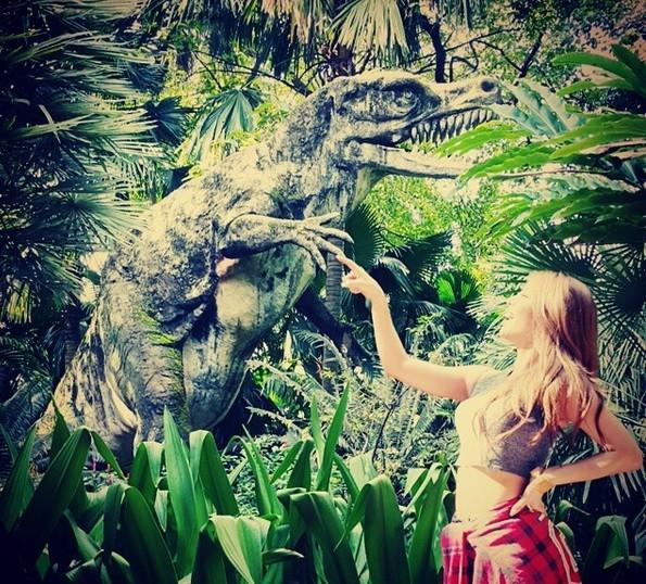 에일리는 공개된 사진 속에서 전시된 공룡 모형앞에 서서 장난스러운 포즈를 취하며 환하게 웃고있다.