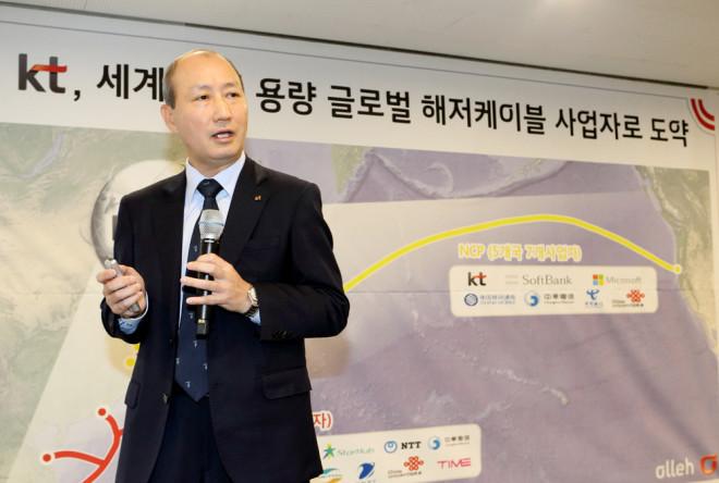 | ▲서울 종로구 광화문에 위치한 KT사옥에서 KT네트워크부문장 오성목 부사장이 KT가 구축 및 운용할 예정인 세계 최대 용량의 글로벌 해저케이블 사업에 대해 설명하고 있다.(사진제공=KT) |