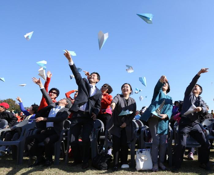 공개된 사진에는 (재)예술경영지원센터 김선영 대표를 비롯한 주요 내빈들이 전국생활문화제의 성공적인 개최를 기원하며 종이비행기를 날리고 있다.