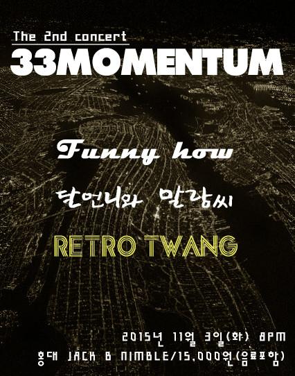 오는 11월 3일 홍대 잭비님블(Jack B Nimble)에서 33모멘텀 소속의 개성있는 뮤지션의 조인트 콘서트가 열린다. 이번 콘서트는 탄탄한 음악성을 바탕으로 오랜 기간 활동하며 홍대 클럽가에서 팬 층을 쌓아가고 있는 인디밴드 3팀이 함께한다.