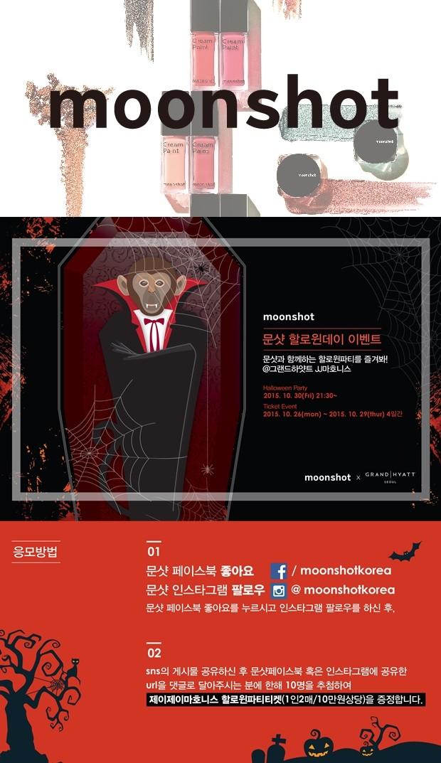 오는 30일 오후 9시 30분 서울 용산구 소월로 '그랜드 하얏트 호텔' JJ마호니스에서 진행되는 '할로윈 데이 파티'에 문샷은 미처 할로윈 데이 분장을 준비하지 못한 참석자들에게 특별한 메이크오버를 제공하며 이외에도 행운권 추첨, 환영 음료 등 다양하고 흥미로운 이벤트가 준비될 예정이다.