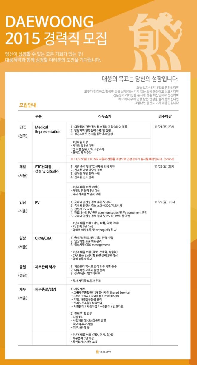 ㈜대웅제약(대표 이종욱)은 대웅제약 채용 홈페이지(daewoong.recruiter.co.kr)를 통해 ‘하이퍼포머(경력사원)’를 공개 채용하고 있다고 밝혔다.
