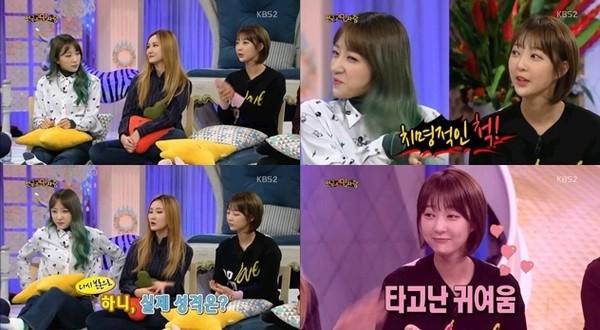 16일 오후 11시 10분 방송된 KBS 2TV 예능프로그램 '대국민 토크쇼 안녕하세요' 에는 올해 역주행의 신화를 쓰며 자타공인 최정상 걸그룹으로 급부상한 걸그룹 EXID의 멤버 하니, 혜린, LE가 함께했다.