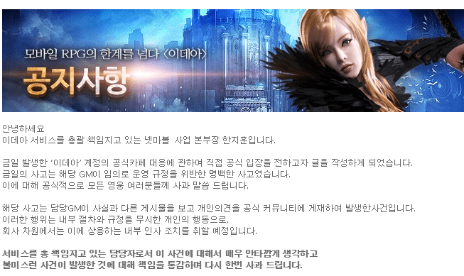 사과문을 통해 넷마블측은 "'이데아' 계정의 공식카페 대응에 관하여 직접 공식 입장을 전하고자 글을 작성하게 됐다"며 "해당 GM이 임의로 운영 규정을 위반한 명백한 사고"였다고 밝혔다.