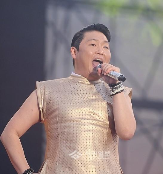 이 날 싸이는 골드빛의 반짝이 슬리브리스를 입고 나와 열창하고 있다.