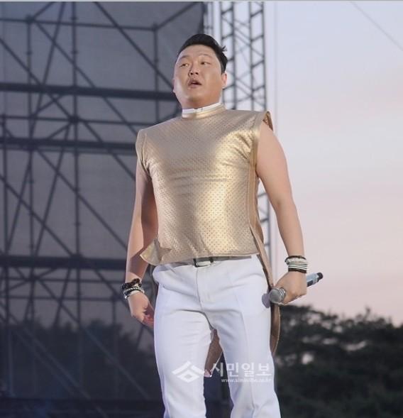 이 날 싸이는 골드빛 슬리브리스와 화이트 팬츠를 입고 압도적인 무대를 선사하고 있다.