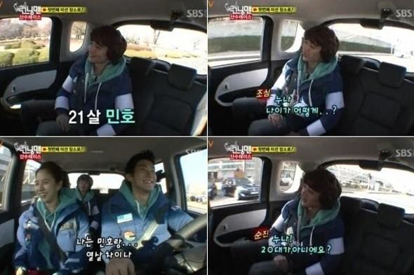 민호는 차를 타고 가던 도중 송지효에게 "누나 나이가 어떻게 되세요?"라고 물었다.