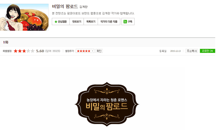 이같은 별점테러를 당한 브랜드웹툰은 <비밀의 팜로드>로 현재 별점이 10점 만점에 5.60점에 불과하다. 별점에는 총 3만9000여명이 참가했다.