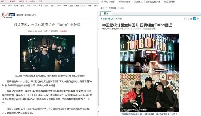 중국에서 영향력이 크다고 알려진 ‘중화망’, 베이징에 위치한 중국 대표 통신언론사 ‘신화통신망’, 중국 정부의 주요 언론사인 ‘광명망’, 상해 소제의 유명 포털 사이트 ‘신민망’, 유명 포털사이트 ‘MSN중국망’, 중국 청년단 중앙위원회에서 운영하는 ‘중국청년망’ 등 중국 내 유명매체를 비롯하여 ‘하이광망’, ‘신화망’, ‘소호망’, ‘화룡망’, ‘북경청년망’ 이 “김종국의 20년 의리와 우정이 빛을 발휘해 3인조 완전체 터보로 부활했다”고 전했다.