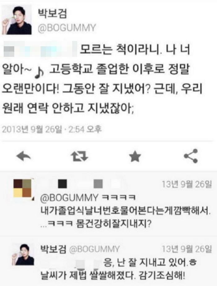 박보검의 학교 동창은 지난해 박보검에게 멘션을 보냈는데 박보검이 답장을 안 하자 "연예인 되고 나서 뜨니까 변했네"라며 박보검을 디스했다.